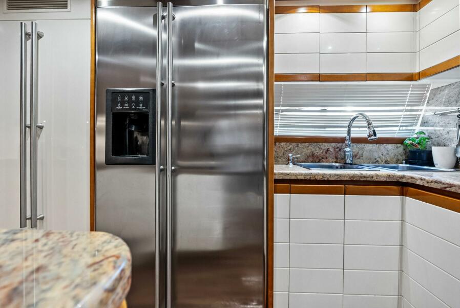 - New Full Galley with Kitchen Aid Fridge, Icemalker, 2 Kenyon Barbecues, Sink, Storage and Black Countertop