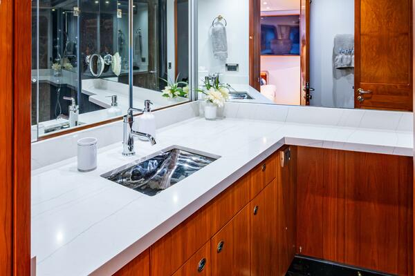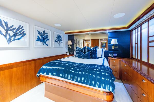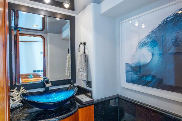 In 2019, Interior Designer Chanel Coontz of Neosage transformed the yacht’s dated gold-and-yellow interior into a serene, modern masterpiece. Coontz introduced a rich indigo palette across soft finishes, complemented by enhanced woodwork, to create a calming, sophisticated aesthetic with minimal disruption. The Day Head was reimagined with sea-inspired elements, featuring wave-like faucets and sleek, cohesive cabinetry for a contemporary feel. The aft bar and dining sideboard were upgraded with elegant Azul stone, blending seamlessly with the yacht’s refined craftsmanship to preserve its heritage while elevating it into a modern oasis at sea.