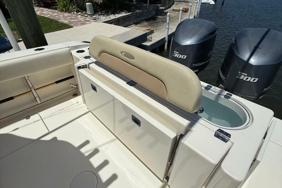 2015 Cobia 296 Center Console boat with Yamaha 300 engines, featuring a livewell and seating.