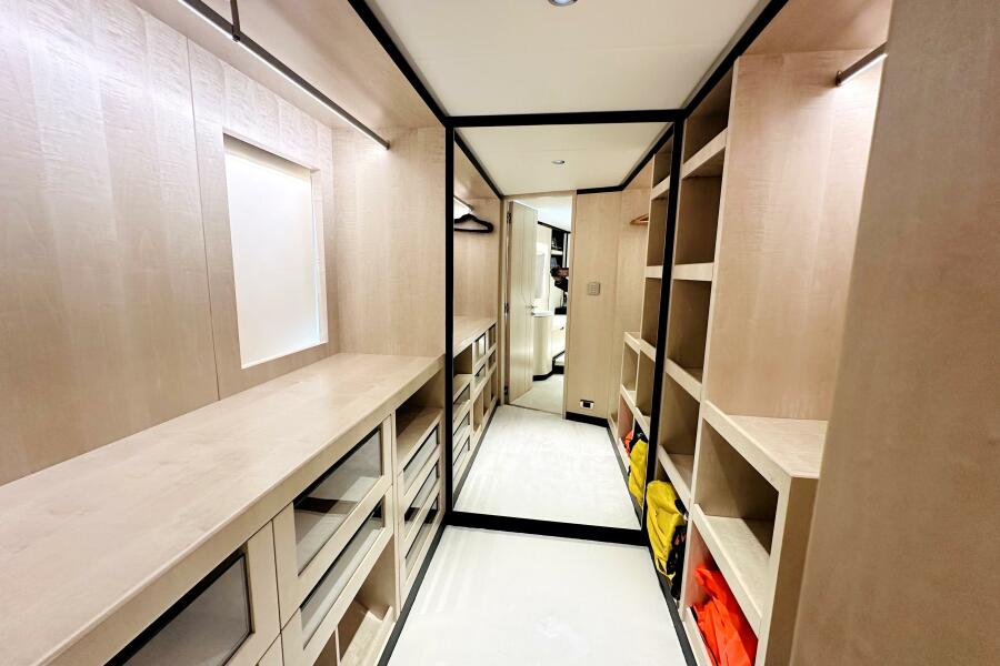 Luxurious walk-in closet on 2023 Majesty 120 yacht, featuring ample shelving and modern design.
