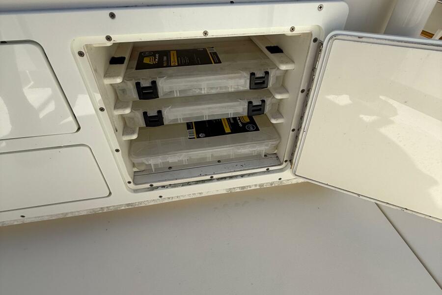 Storage compartment with tackle boxes on a 2015 Cobia 296 Center Console boat.