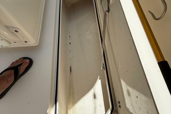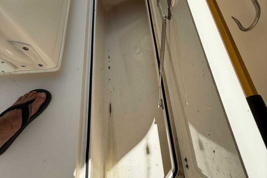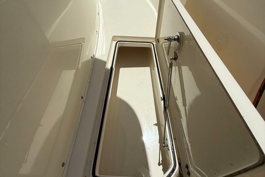 2015 Cobia 296 Center Console storage compartment, open lid, interior view.