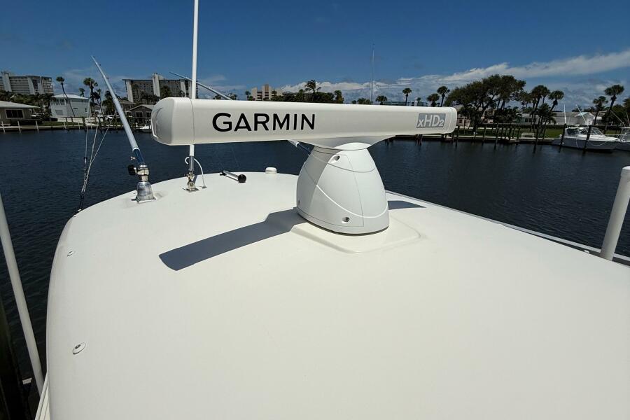 2015 Cobia 296 Center Console with Garmin xHD2 radar on deck, docked by waterfront.