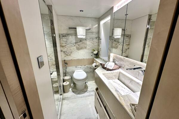 Luxurious marble bathroom in 2023 Majesty 120 yacht, featuring glass shower and modern fixtures.