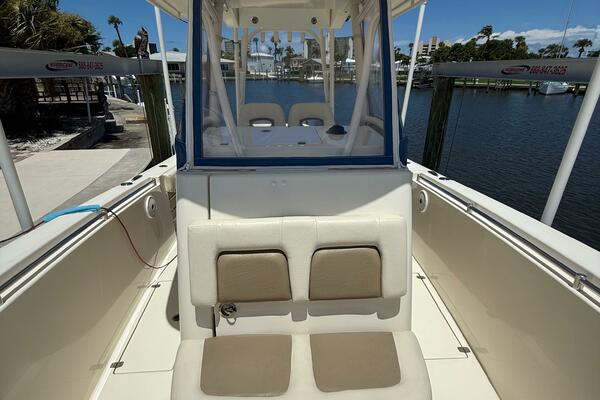 2015 Cobia 296 Center Console boat interior with seating, docked by the water.