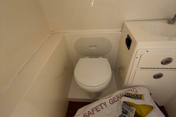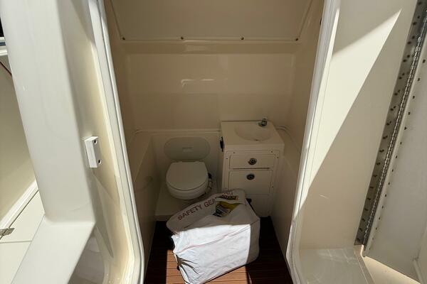 2015 Cobia 296 Center Console boat bathroom with toilet and safety gear bag.