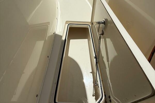 Open storage compartment on 2015 Cobia 296 Center Console boat deck.