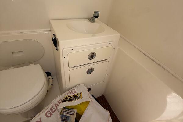2015 Cobia 296 Center Console boat bathroom with sink and storage.