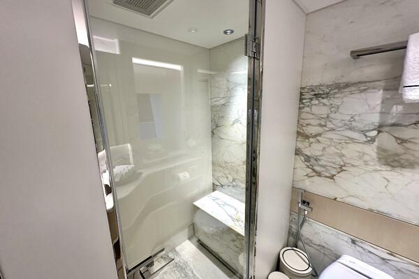 Luxurious marble bathroom in 2023 Majesty 120 yacht, featuring modern shower and elegant design.