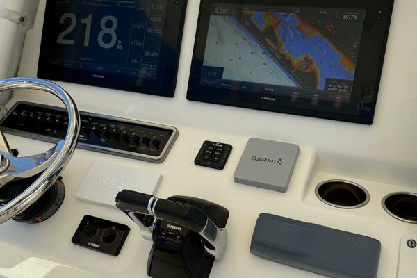 2015 Cobia 296 Center Console dashboard with Garmin navigation displays and Yamaha controls.