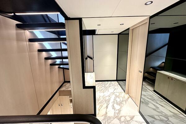 Luxurious interior hallway of 2023 Majesty 120 yacht with modern design and staircase.